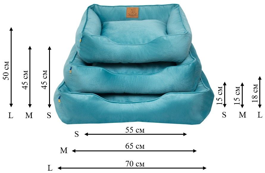 Розміри: лежаки Бегемотъ представлені моделями 55*45*15 см, 65*45*15 см, 70*50*15, 80*60*15 см та 90*65*15 см (вказані загальні габаритні розміри лежака від краю до краю бортів), далі умовно розділяємо їх на розміри XS, S, M, L, XL.