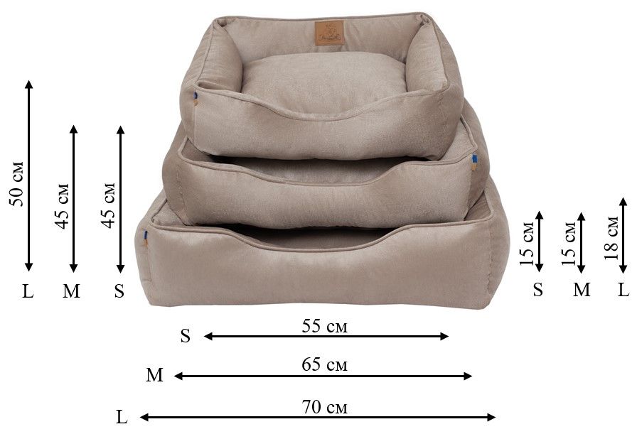 Розміри: лежаки Бегемотъ представлені моделями 55*45*15 см, 65*45*15 см, 70*50*15, 80*60*15 см та 90*65*15 см (вказані загальні габаритні розміри лежака від краю до краю бортів), далі умовно розділяємо їх на розміри XS, S, M, L, XL.